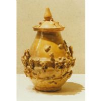 蓋頂塑有鳥形,器身為直口,腹身呈塔狀起棱為四層臺,自上而下,一層堆塑有魚,狗,鳥,羊,雞.二層,三層為送葬圖.四層又塑有鳥,龜?shù)?釉色青黃,底部無釉,是一件從器物造型和胎釉特征上較為典型的婺州窯產(chǎn)品.