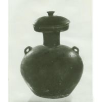 盤口,有蓋,細(xì)直頸,斜肩,鼓腹,平底,肩部置二系,器身素面無紋,蓋面三道弦紋,平面圓鈕.