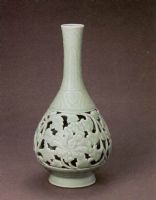 套瓶為小瓶外套大瓶,外瓶上口微撇,頸細長,腹下垂豐滿,為“玉壺春瓶”式。通體及足內(nèi)均施青釉。頸部印蕉葉紋及仰覆如意頭云紋,腹部為鏤空纏枝牡丹紋。
