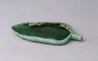 洗卷邊葉子式,葉脈內(nèi)凹外凸,一端有葉莖,葉片上飾蟲蛀孔。
