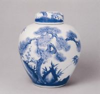 罐直口,短頸,圓腹下收,圈足,圓蓋。器身通景青花繪松、竹、梅、空間襯以洞石、靈芝等花草。