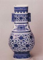 壺方形口,頸飾對(duì)稱貫耳,垂腹,方圈足,足側(cè)有用于穿帶的對(duì)稱方孔。主體青花紋飾以纏枝花為主,輔以海水、回紋、如意云頭、忍冬、變形蓮瓣紋等邊飾。