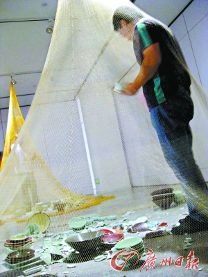 表演現場放置著三張被懸掛起來的漁網,網內有各種瓷器。表演中,金光石鉆進網內,將一件件完整的瓷器往地上砸,聲音刺耳。表演持續(xù)了5分鐘左右,表演者表情平靜,胸有成竹,但由于沒有任何解說,旁邊的觀眾卻有些摸不著頭腦。“好浪費!”一個孩子忍不住小聲說。