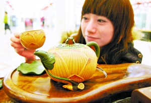 已故中國工藝美術(shù)大師蔣蓉歷時兩年多完成的作品——“青蛙蓮心荷葉壺”,出現(xiàn)在北京愛家收藏品市場舉辦的“宜人壺莊紫砂精品展”上。這把紫砂壺上的“小青蛙”和10個“蓮藕”都能在倒水時神奇地動起來,目前該壺的市場售價已達(dá)45萬元。