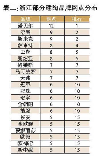 作為浙江本地品牌,諾貝爾在自己的家門口以絕對優(yōu)勢壓過其它品牌而位居網點排行的首位。而上海品牌斯米克、亞細亞也打破在其它地區(qū)的尷尬境地,在浙江的二、三級市場嶄露頭角,與佛山品牌一決高下。