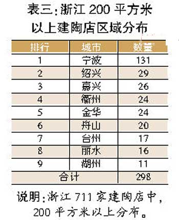 從區(qū)域分布來看(見表三),位于東海之濱的寧波作為副省級城市無疑成為浙江陶瓷二、三級市場的主角,其200平方米以上陶瓷店數(shù)量就超過全部地級市場的40%。而紹興、嘉興兩地的發(fā)展?jié)摿σ膊豢珊鲆暋?/p>
