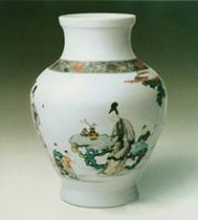 洗口,短頸,溜肩,圓腹,腹以下漸收,圈足外撇。主題紋篩為通景庭園仕女嬰戲圖。所繪仕女均發(fā)髻高聳,面目清秀。施彩方面云朵用紅彩勾邊填彩,其余則以黑彩勾邊,根據需要隨類敷彩,以淡綠、深綠色為主,間施紅、黃、褐、黑、藍等色。罐肩描繪錦地纏枝菊紋。