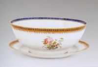 碗敞口,口沿藍(lán)彩上有描金紋飾。碗外壁繪紅玫瑰,配以蘭、黃色小花和綠色枝葉,邊有瑞典文“安娜”。