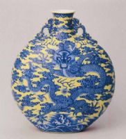 壺口微撇,短頸,頸、肩相交處飾對(duì)稱夔鳳耳,扁圓腹,隨圓形圈足。通體施黃釉地,青花繪正面龍戲珠紋,點(diǎn)綴以蝙蝠、朵云,近足處飾海水江崖紋,口沿輔以如意云頭紋邊飾。