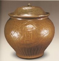 罐短頸,溜肩,豐腹,平底,淺圈足。荷葉式蓋。罐內(nèi)外施青釉,腹部凸印四菱形開(kāi)光,開(kāi)光內(nèi)分別印[清香美酒]四字楷書(shū),開(kāi)光外凸印纏枝花卉。