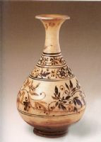 瓶撇口,細(xì)長頸,溜肩,圓腹,圈足,足內(nèi)砂底無釉,俗稱[玉壺春瓶]。通體以白地黑花為飾。肩部繪卷草紋和卷草花紋各一周。腹部繪折枝菊花兩組。此瓶造型優(yōu)美,線條流暢,紋飾活潑,是磁州窯的精美作品。