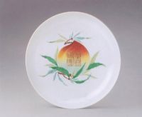 盤敞口,弧壁,圈足。盤心繪一折枝桃,枝干用赭色,葉用翠綠和草綠,桃用紅,黃,綠彩,葉脈用黑彩,桃中心金彩篆書“萬”,“壽”二字。
