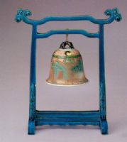 鐘仿青銅器造型,鐘頂留一小孔,鈕為藍(lán)釉瑞獸,自上而下共繪四層紋飾,上層冰裂紋地上以綠,藍(lán),金彩繪八卦紋,第二層綠彩繪仰覆三角紋,腹部紅彩斜方回紋錦地上綠彩繪四獸面,獸面間繪上仰下覆式如意紋,下層紅彩冰裂味地上黃,黑彩繪陰陽魚紋各四個(gè)。