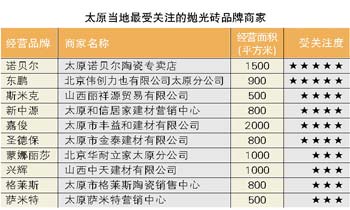 目前太原有陶瓷商戶將近600家,其中經(jīng)營(yíng)拋光磚的商家有450多家,占到整個(gè)陶瓷商家的75%以上,這些經(jīng)銷商主要分布在太原現(xiàn)代家居大世界、太原居然之家、美麗家園、明珠裝飾城和明珠陶瓷城等太原中高低檔賣場(chǎng)。進(jìn)入太原的拋光磚品牌有諾貝爾、東鵬、斯米克、冠軍、蒙娜麗莎、新中源、圣德保、薩米特、格萊斯、興輝等。中高檔拋光磚已成為太原市場(chǎng)的主流,無(wú)論是零售,工程還是渠道方面,都有穩(wěn)步提高。在消費(fèi)的習(xí)慣上,消費(fèi)者更注重拋光磚產(chǎn)品的品牌和價(jià)格。