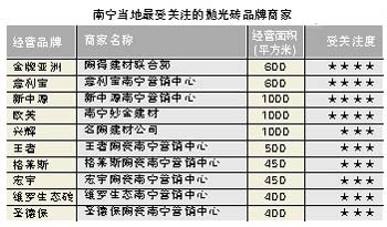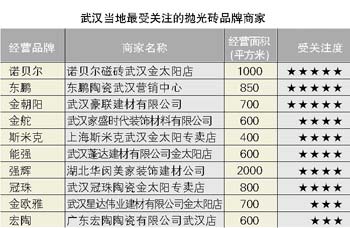 武漢的大部分商家熱衷于經(jīng)營(yíng)具有一定知名度的拋光磚品牌。市場(chǎng)上比較活躍的拋光磚品牌有諾貝爾、東鵬、金朝陽(yáng)、金舵、斯米克、薩米特、能強(qiáng)、強(qiáng)輝、金歐雅等。當(dāng)?shù)厥袌?chǎng)上經(jīng)營(yíng)拋光磚的商家占建筑陶瓷商戶的近90%。其中比較有影響力的品牌和商戶主要集中在金太陽(yáng)建材廣場(chǎng)、漢西貨場(chǎng)、時(shí)代建材精品城、康家建材廣場(chǎng)和宜家建材廣場(chǎng)等地。