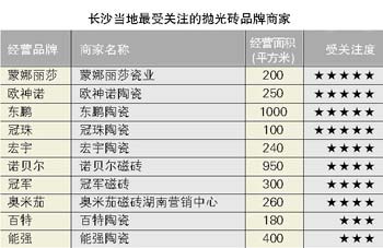 長(zhǎng)沙市仿古風(fēng)漸起,除去工程以外,拋光磚和仿古磚的市場(chǎng)比例大概是4:6。在長(zhǎng)沙地區(qū),國(guó)內(nèi)的拋光磚品牌幾乎都有入駐,主要品牌有L&D、歐神諾、蒙娜麗莎、宏宇、百特、東鵬、信和、百思特、德冠、奧米茄、長(zhǎng)航、格萊斯、諾貝爾等,經(jīng)營(yíng)拋光磚的商家總共有620家,主要集中在馬王堆陶瓷建材城和瑞祥陶瓷市場(chǎng),有225家,占總商家數(shù)量的36.3%。在消費(fèi)水平比較高,而收入較低的長(zhǎng)沙,消費(fèi)者更看重的是價(jià)格和質(zhì)量,性價(jià)比高的中高檔品牌比較受歡迎。