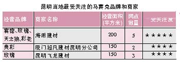 昆明市專業(yè)經營馬賽克的商戶有7家,主要分布在大商匯、云紡商業(yè)區(qū)、西南建材市場、昆明建材商業(yè)城、華洋家居廣場。據調查,在昆明的馬賽克品牌主要有賽德、玫瑰、天之狼、彩花、小精靈、典彩、小石頭、越王等。