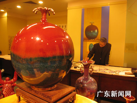 這次主題為“國禮鈞瓷走進(jìn)廣州”的鈞瓷與嶺南書畫聯(lián)展,展示的鈞瓷珍品有茄皮紫、玫瑰紫、雞血紅等多種窯變色彩,宛如蔚藍(lán)色的天空出現(xiàn)一片彩霞,五彩滲化,相映交輝;釉中的流紋更是形如流云,變化莫測,意境無窮。