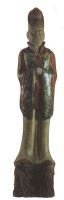 俑頭戴高冠,其上有一鹖,面部稍胖,濃眉大眼,寬鼻闊口。身穿翻領(lǐng)寬袖長(zhǎng)袍,外披護(hù)胸,護(hù)胸和袖口為墨綠白花紋。下穿白色長(zhǎng)裙拖地。露出鞋尖。雙手拱於胸前,立於一橢圓座上。
