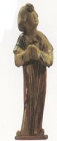 俑頭向左上方仰望,髮鬢垂髻,面部豐腴,長眉細(xì)目目,嘴小鼻挺。上身穿圓領(lǐng)對(duì)稱短衫,右肩披藍(lán)色巾。下身穿黃色曳地長裙,裙角處露出翹頭鞋尖。雙手?jǐn)n在袖中,置於胸前。