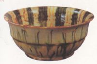 白胎。敞口,弧壁,腹中部有凸棱一道,圈足。內外壁均以米黃色釉為地,外壁施黃、綠釉細條,內外壁施綠色寬垂條紋和褐色細條紋。此器造型優(yōu)美,釉彩鮮麗,晶瑩潤澤,形成彩色斑斕的裝飾效果,顯示出三彩花釉之美,是三彩器中之佳作。
