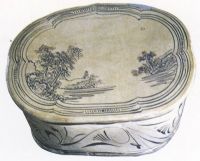 枕面里元寶形,枕面白地黑彩繪山水、人物觀日圖。枕側(cè)繪纏枝花卉紋,底部有“強(qiáng)家造"長方戳記。唐宋晴期,由於商業(yè)的繁榮和封瓷器需求量的不斷增大,褚窯產(chǎn)品出現(xiàn)了激烈競爭的局面,為此生產(chǎn)者紛紛在自己的產(chǎn)品上標(biāo)明姓氏或作坊名。