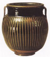直口,捲沿,直鞭,圓頸,圈足。腹部飾凸起的平行豎線紋,線呈白色。頸肩部塑有對稱的蕖形雙繁,其上刻劃葉紋樣。器內(nèi)施醬色釉,器外為黑釉。白線紋裝飾的瓷器為山柬、河南一帶所產(chǎn),具有較強(qiáng)的地方特色。
