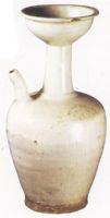 洗口,圓唇,細(xì)長頸,豐肩,肩一側(cè)附流,下腹斜收,假圈足。灰白胎,胎質(zhì)較粗,施白釉,釉色灰白泛青,釉質(zhì)溫潤。出土於遼代墓葬,輿之同出的有白釉花式口碗、白釉盤、盂和三彩。