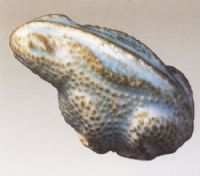 整體造型塑成一個(gè)生動的小蟾蜍作鳴叫狀,圓口,鼓腹,首微昂,似欲跳躥,全身施青白釉,釉面光潔明亮。此器造型獨(dú)特,為像生瓷中的佳作,釉面磨損。