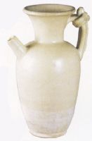 侈口,束腰,圓肩,圓腹,管狀流,頸肩之間有一曲柄,柄上附一圓頭形裝飾。白釉,質(zhì)細(xì)且堅(jiān),施多半截釉,釉色白中泛黃。此壺為定窰產(chǎn)品。