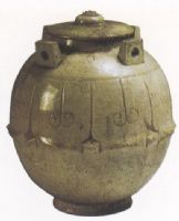 口微斂,帶蓋,罐身近橢圓形,平底。蓋圓形,頂上有葫蘆形鈕,下有子口輿器口吻合。肩部綴橋形繫,繫間浮雕實(shí)相花紋。腹中部塑覆蘧花瓣,瓣肉刻蕨首敘。胎色淺紅,釉青中泛黃。實(shí)相花紋和覆蓮花紋,是北方時(shí)期北方瓷器中的典型紋飾,時(shí)代特徵鮮明。