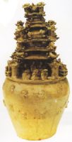 整器分蓋、體雨部分。罐上堆塑一座內(nèi)圓外方的九層庶殿式樓臺,每層均塑有闕或小盂、動物、人物、長條觀廊。九層樓臺層層相疊,氣勢雄偉。罐的盤口及腹上部塑有人騎龔獸及各種動物。 此罐為多種材料裝飾為一體,結(jié)構(gòu)繁複,展示了東吳時期的越窰青瓷的製作高超水平。