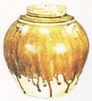 斂口,鼓腹,肩部四繫,器身以麻布紋作裝飾,器身外壁施青釉,呈黃褐色,釉層較厚,不及底,且有流釉現(xiàn)象,其自然流淌的效果頗具裝飾意味。整體造型完整,器體較大,極為少見。