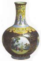 器作天球瓶,高頸,圓腹,圓足。胎細(xì)釉精。腹部圓形開光內(nèi),月白色地,施粉彩,繪頑童戲耍,並以山石松海為背景。開光之外齊藍(lán)釉為地,施金彩,繪纏枝蓮紋。此器為景德鎮(zhèn)窰產(chǎn)品,天球施乾隆皇帝所賜祭品中的精品。