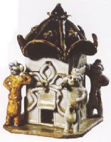 驕身方形,下有削角四方形平托,驕頂六角攢尖式,上飾受花寶珠。六平片砂弧形頂檐翹起,六角脊作繩緊紋,各坡塑一朵四瓣花。四名糯夫扛驕桿,頭戴樸頭,腰緊腰帶,前後掛襠布,一手扶桿,一手叉腰。除驕頂施黑釉外,其淤為白釉,驕頂和驕夫身上還加點黑彩,釉質(zhì)晶瑩。此器造型福特,十分珍貴。