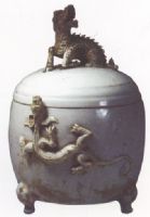 子母口,圓腹,平底,三獸足,圓形蓋。器腹部凸雕二蟠螭紋,蓋頂堆塑一蹲坐麒麟,強口回首狀。通體施白釉。胎體厚重,釉色肥厚光亮。