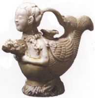 此器作人首魚身狀,人首為少女頭像,手握龍頭形水流。器物造型構(gòu)思獨(dú)特,展示了遼代陶工的豐富想像力和制造力,製作精巧,集堆貼、雕刻於i身,栩栩如生。