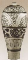 小口,直頭,鼓腹,下腹部漸收成小平底。施自釉,其上黑彩裝飾i花紋,肩及上腹部裝飾纏枝蓮圖案,中部為牡丹圖案,下腹部為仰蓮瓣紋。