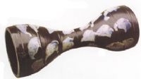 腰鼓呈長圓筒形,兩頭粗中腰細,鼓身凸起七道弦紋,通體施黑釉,釉色漆黑光亮,并飾有藍色斑塊。此鼓形制較大,器形規(guī)整,腺條柔和優(yōu)美。