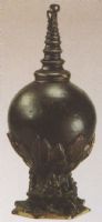 器身呈圓球狀,下承以多邊形底座,座上鏤雕佛像、人物和花卉等。蓋作七級寶塔形,頂端塑有一小猴。通體施黑釉,烏黑光亮。此器出土於耀州窰。