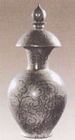 喇叭狀口,粗頭,圓形腹,圈足。半球狀蓋,蓋頂飾有蓮花苞式鈕。通體飾褐彩雲(yún)氯紋,外施青釉,釉泛黃。此器是越窰的產(chǎn)品,出土於水丘氏墓中,墓主為五代吳國王錢謬的母親。