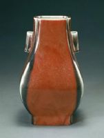 瓶長方形,直口,溜肩,鼓腹,方圈足。頸側(cè)對稱置貫耳?谙轮良甾D(zhuǎn)折處呈委角狀。通體施窯變釉。足內(nèi)露白胎。外底陰刻楷書“大清光緒年制”六字雙行款。