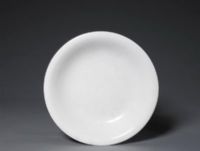 盤撇口,淺腹,圈足。胎體厚重。通體施白釉。盤心刻牡丹花紋。