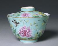 碗圓蓋,抓鈕,口微撇,弧腹,圈足。以粉彩為飾,蓋口沿涂金線一周,碗內(nèi)壁施白釉,蓋面及碗外壁施綠釉,其上繪飛鳥和花卉紋。蓋鈕里及碗外底以紅彩書“大清光緒年制”六字楷書款。