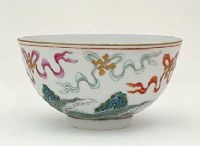 碗直口,弧腹,圈足。碗內光素。外壁以粉彩為飾,口沿描金及紅線各一周,腹部主題圖案繪海水江崖,以江水、山石表示江山,其上為六組不同色彩的飄帶,每組飄帶的中心都有描金“卍”字,寓意“江山萬代”,此為光緒時期瓷器上常見的裝飾題材。外底署青花“大清光緒年制”雙行六字楷書款。