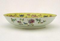 此粉彩盤飾以黃、藍(lán)、綠、粉、金等色彩,盤內(nèi)花紋密布,盤外紋飾疏朗。其紋飾輪廓均用金彩勾勒,色彩富麗堂皇,充分顯示出宮廷特色。
