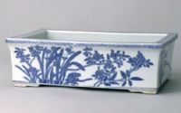 盆長方形,口微撇,直腹,平底,底四角各有一小足。口沿上繪變形回紋一周,沿邊繪卷草紋,腹部四面各繪一組水仙花。底心寫有青花篆書“體和殿制”四字款。