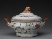 湯盆呈橢圓形,置對(duì)稱扁耳。穹形蓋,上置貝式紐。內(nèi)施白釉。外白地粉彩裝飾。器身及蓋粉彩加金描繪山石、牡丹、桃枝、孔雀、雛雞等紋飾,由四季花束分隔出各自的主題圖案。與粉彩孔雀牡丹紋托盤屬于一套餐具中的兩件。