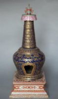 此塔為藏式塔。頂飾如意寶瓶,下為粉色地寶蓋。寶蓋下是十三相輪,象征十三天。十三相輪及塔身均施霽藍色釉地,上以金彩描繪勾蓮、獸面及瓔珞紋等。塔身內(nèi)空,一側(cè)開有歡門,內(nèi)可放置佛像。最下是粉彩須彌方座,飾有纏枝、蕃蓮等圖案。塔座內(nèi)空,可放置佛經(jīng)。