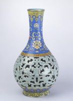 瓶呈膽式,細長頸,垂腹,圈足。瓶內(nèi)施松石綠釉。瓶口、足沿涂金彩,瓶頸近口沿處、圈足外墻以黃地軋道粉彩花卉紋裝飾,頸部飾藍地軋道粉彩勾蓮紋,腹部飾青釉鏤空描金夔鳳紋。瓶內(nèi)附一小瓶。足內(nèi)施松石綠釉,外底心方形留白處署青花篆書“大清乾隆年制”六字三行款。